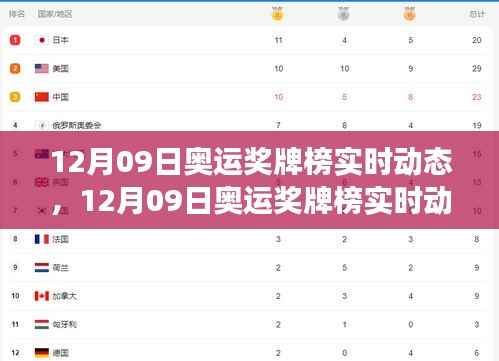 12月9日的奥运奖牌榜实时动态展现了全球体育盛事的荣誉时刻,我们见证了众多精彩对决和荣誉瞬间,感受到了运动员们的拼搏精神,让我们继续关注奥运奖牌榜的动态,共同为运动员们加油助威,在这个充满竞技激情的时刻,让我们共同见证更多辉煌的成就。